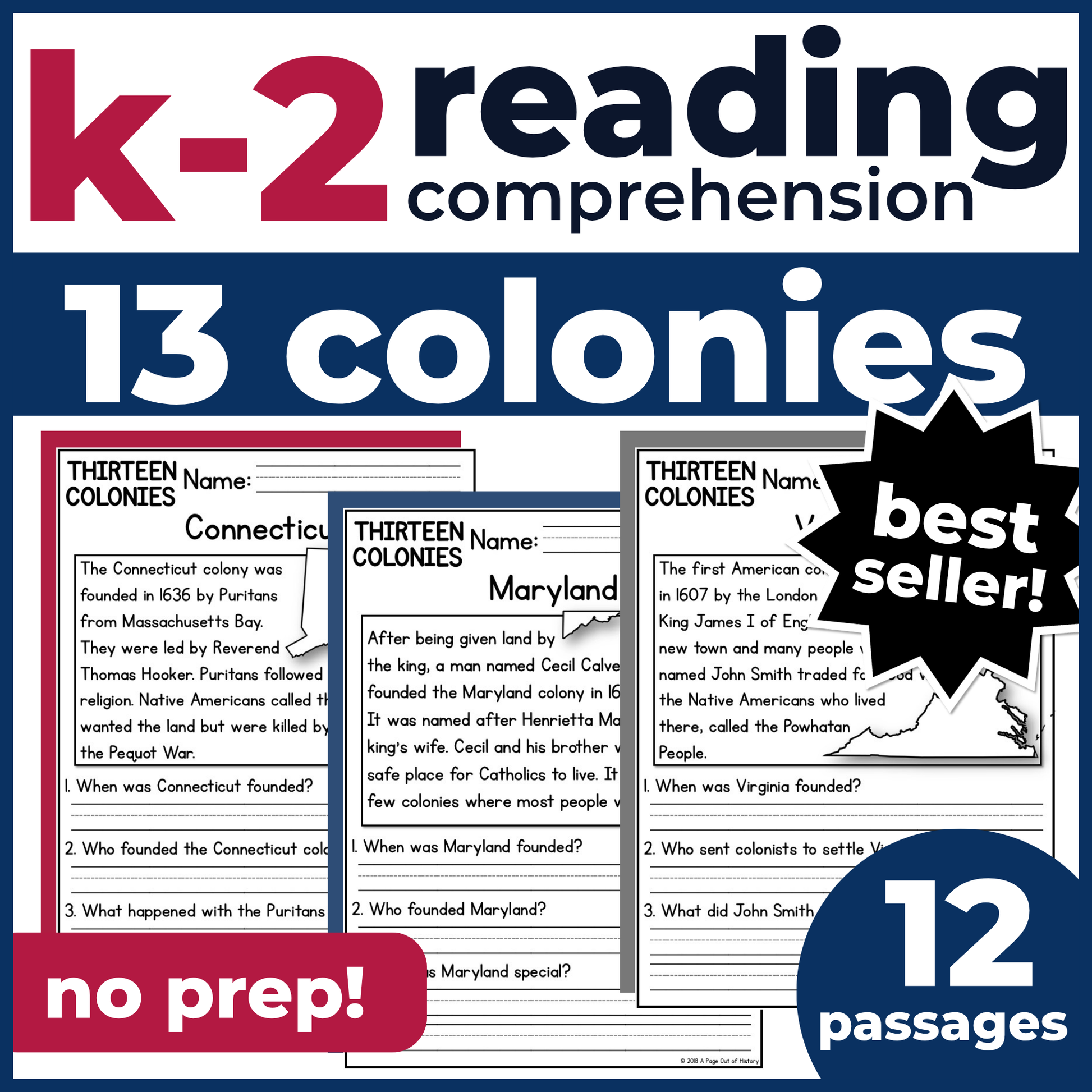 Looking for a no-prep 13 Colonies reading activity to build early literacy skills while keeping learners engaged? These 13 Colonies–themed reading comprehension passages are designed for young readers at a Kindergarten, 1st grade, or 2nd grade reading level. Each passage supports fluency, vocabulary development, and comprehension strategies, and features engaging nonfiction texts centered around Early American History and Colonial America.