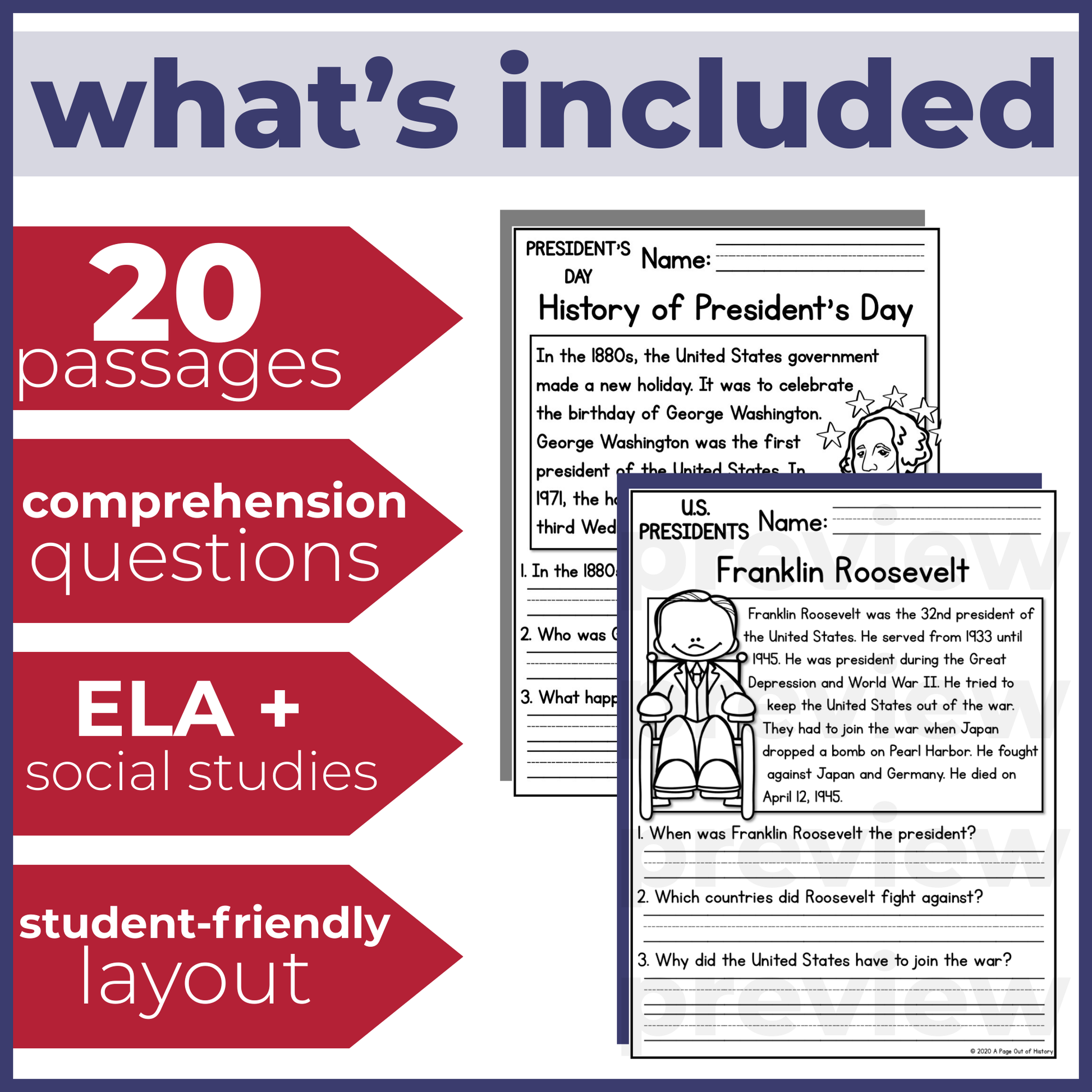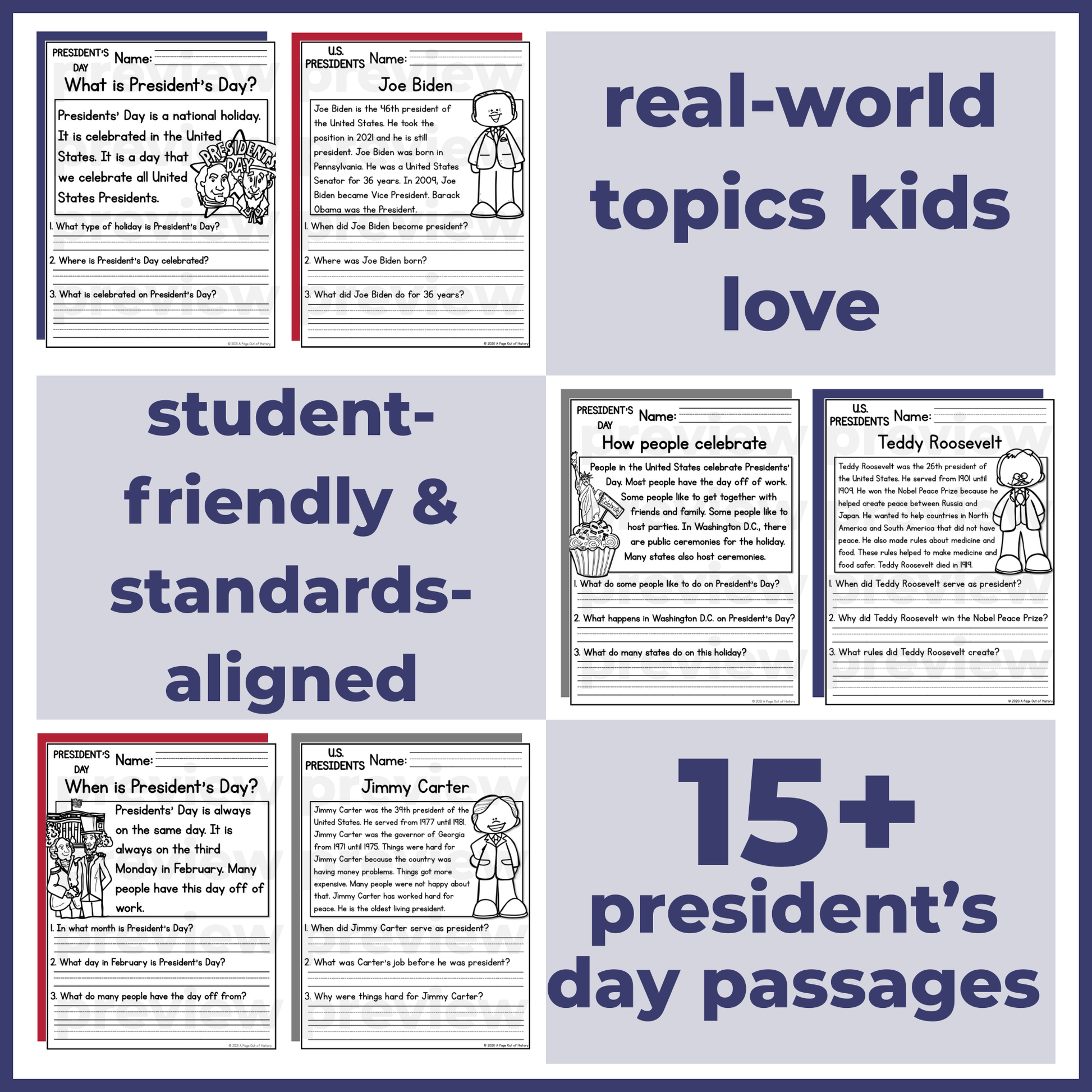 Each passage introduces important and age-appropriate information connected to President’s Day and U.S. Presidents, helping learners build background knowledge about government and leadership concepts in a clear and accessible way. Students strengthen nonfiction literacy development while exploring biography studies, democracy basics, and the role of American leaders in history.