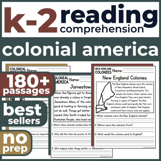 Looking for a no-prep Colonial America reading activity to build early literacy skills while keeping learners engaged? These Colonial America-themed reading comprehension passages are designed for young readers at a Kindergarten, 1st grade, or 2nd grade reading level. Each passage supports fluency, vocabulary development, and comprehension strategies, and features engaging nonfiction texts centered around Colonial America, the 13 Colonies, and daily colonial life.