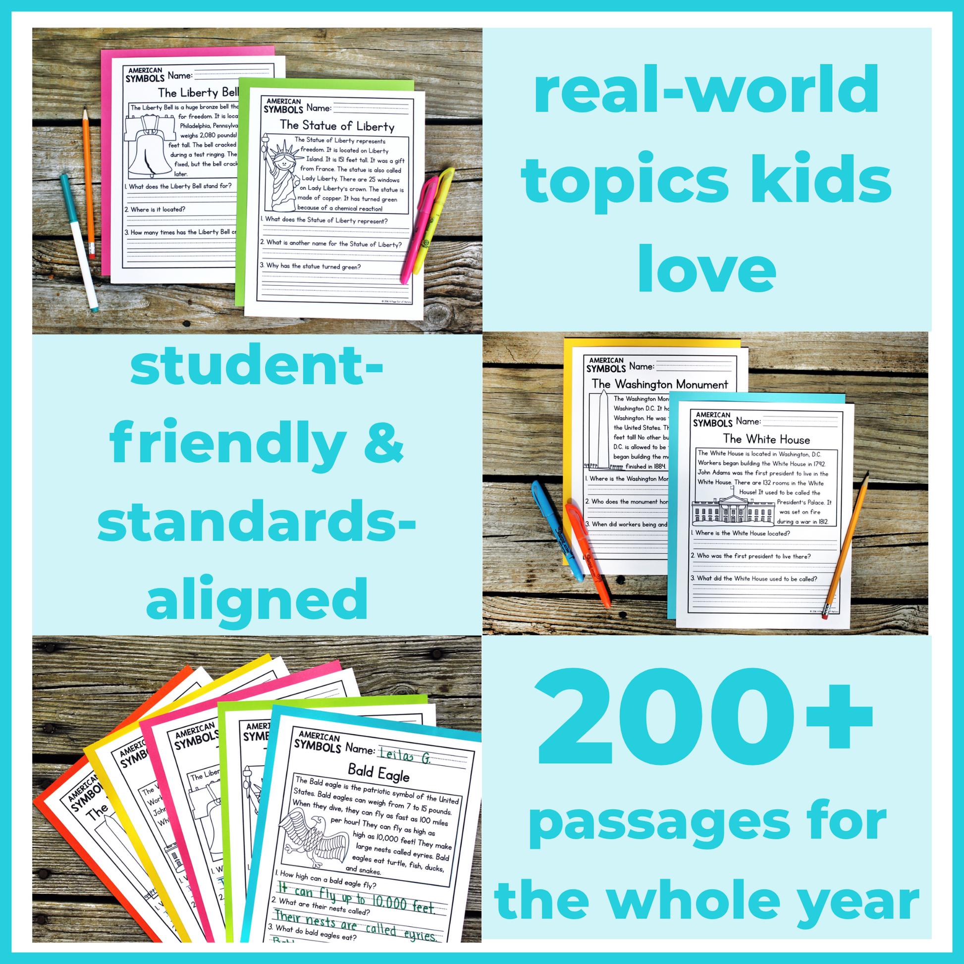 - 10–12 Reading Passages per Topic (grade-appropriate for 1st & 2nd grade)