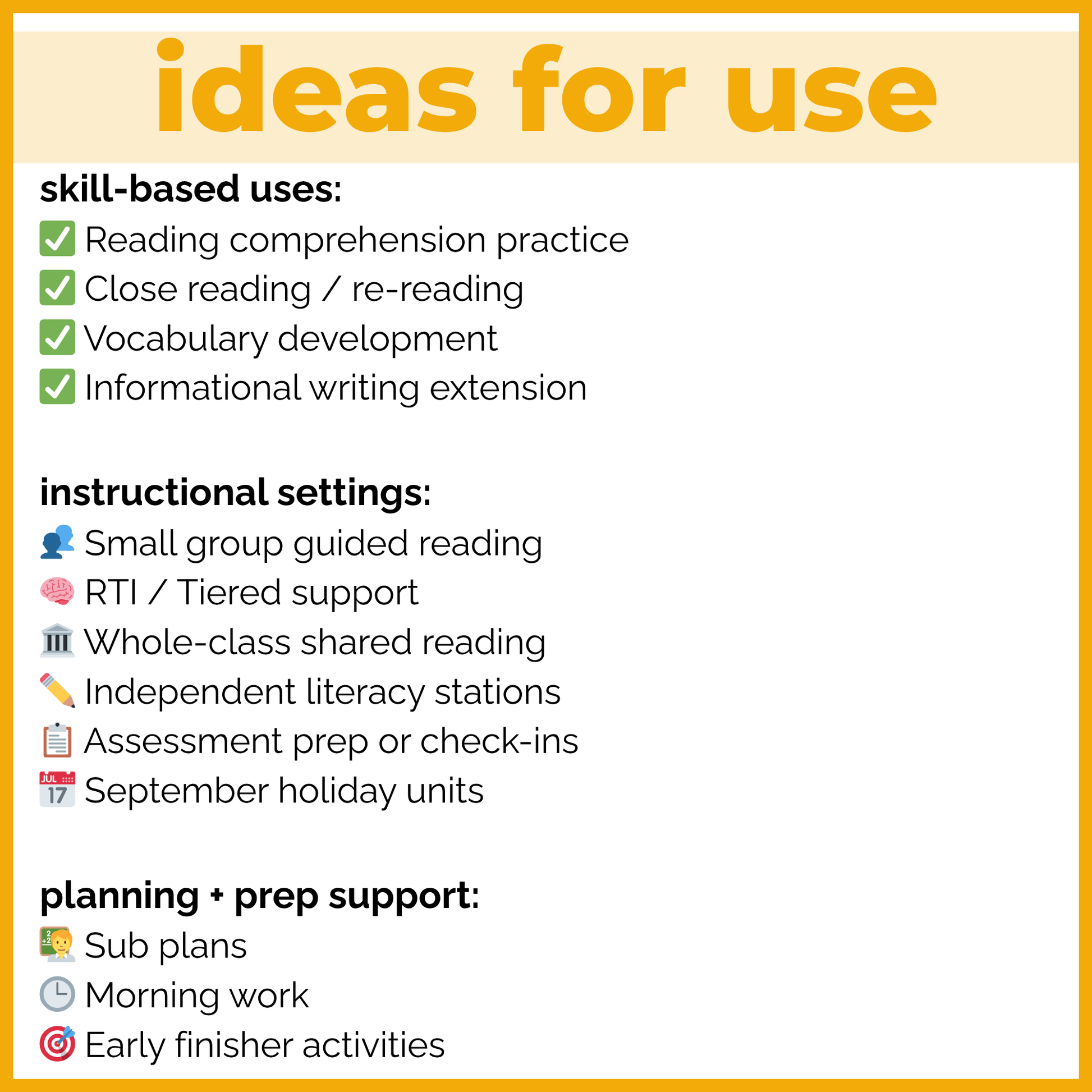 Looking for a no-prep September holidays reading activity to build early literacy skills while keeping learners engaged? These September holidays-themed reading comprehension passages are designed for young readers at a Kindergarten, 1st grade, or 2nd grade reading level. Each passage supports fluency, vocabulary development, and comprehension strategies, and features engaging nonfiction texts centered around September holidays, including Labor Day, Patriot Day, and Rosh Hashanah.