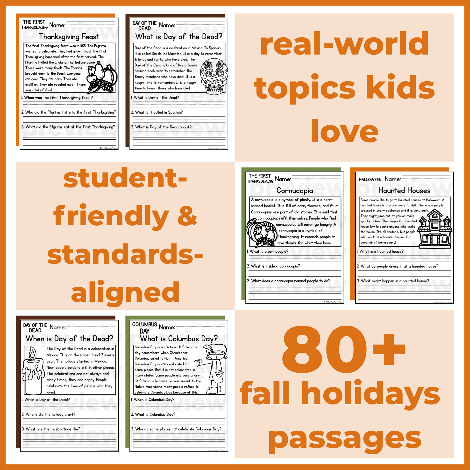 Each passage introduces familiar and meaningful topics connected to fall holidays, helping learners strengthen reading comprehension, build vocabulary, and develop cultural awareness through seasonal learning themes.