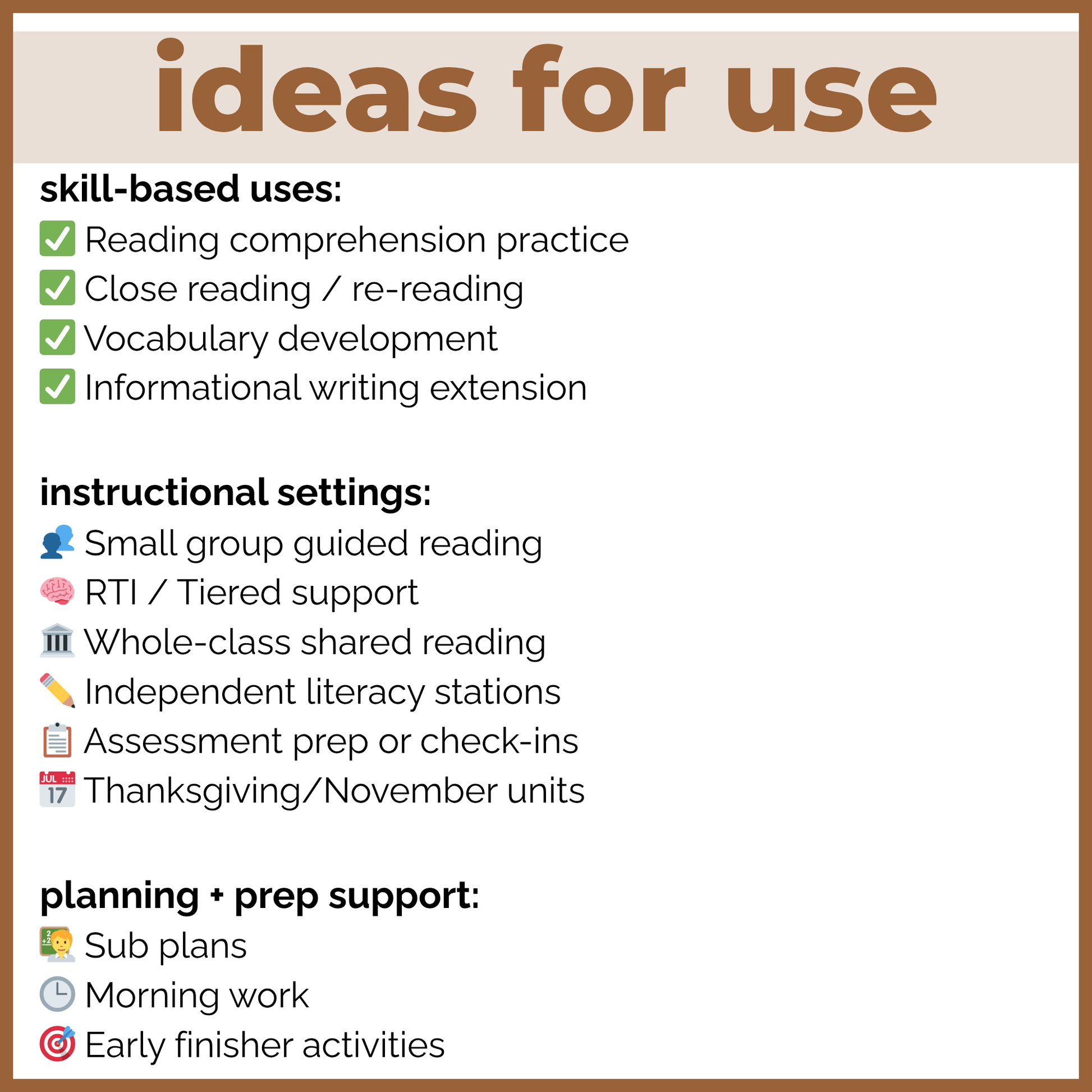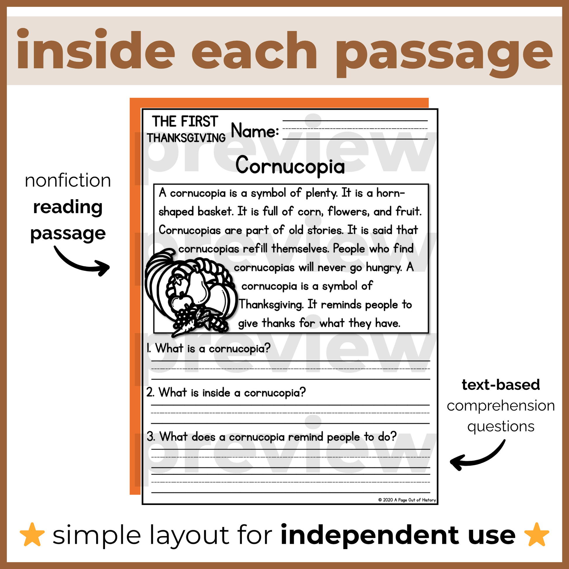Each passage introduces fun, familiar topics connected to Thanksgiving history, helping learners build key reading skills in a meaningful and engaging way.