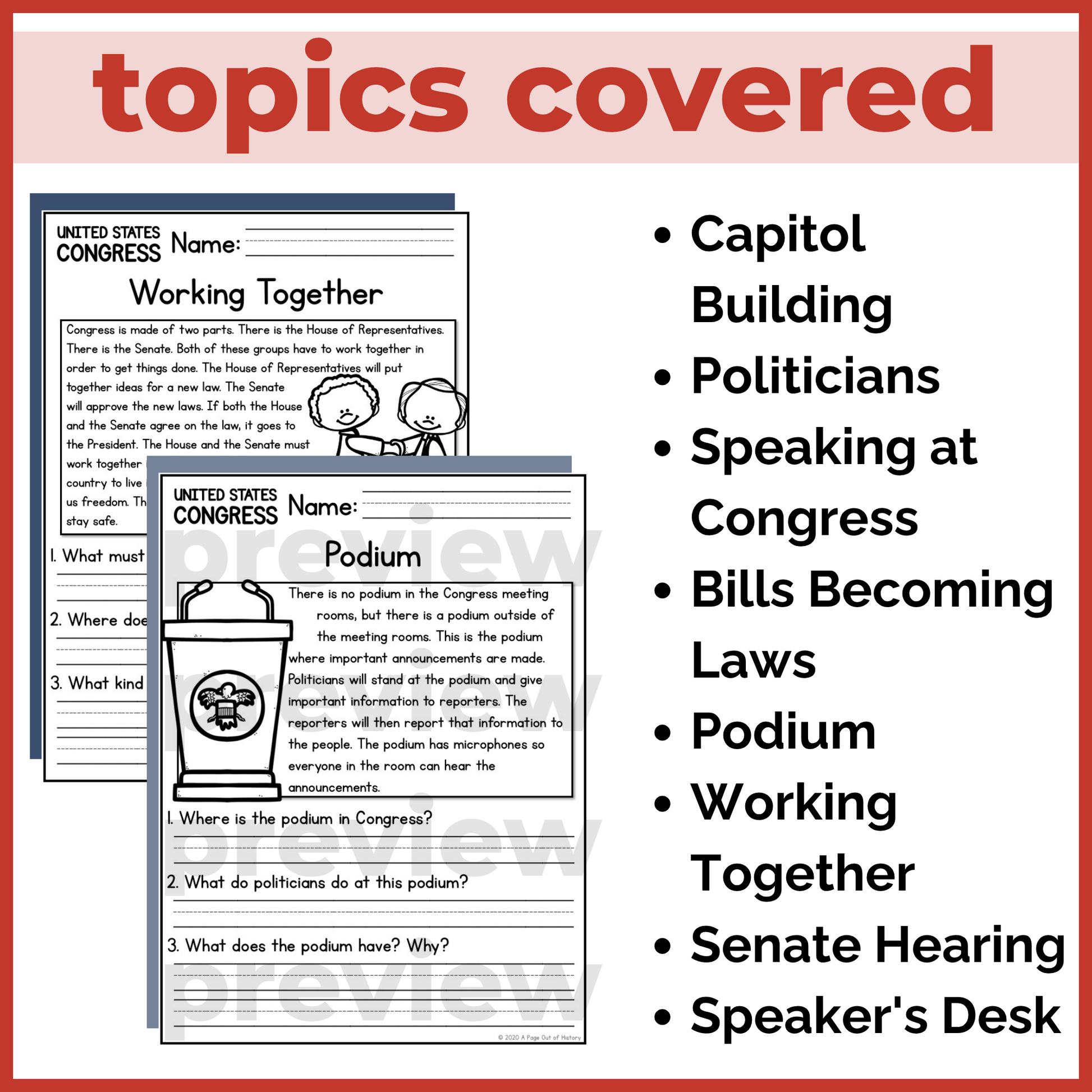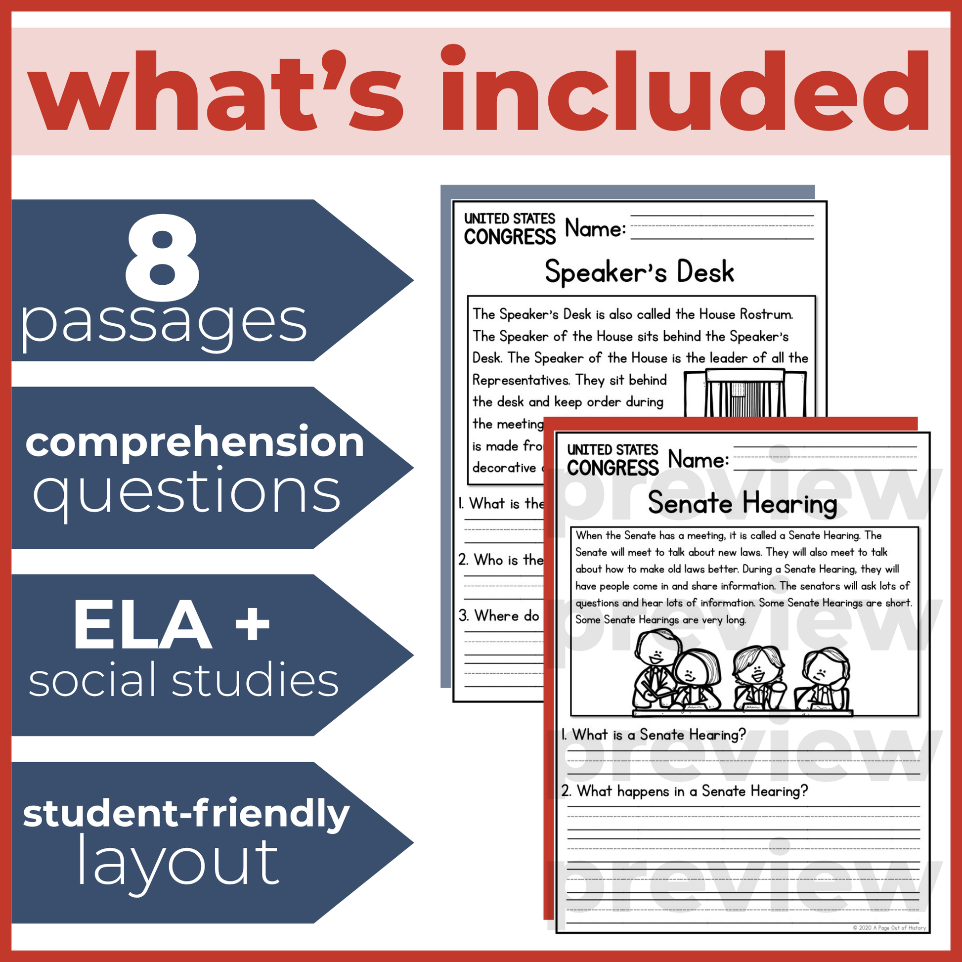 Looking for a no-prep US Congress reading activity to build early literacy skills while keeping learners engaged? These US Congress–themed reading comprehension passages are designed for young readers at a Kindergarten, 1st grade, or 2nd grade reading level. Each passage supports fluency, vocabulary development, and comprehension strategies, and features engaging nonfiction texts centered around the legislative branch of government and US civics education.