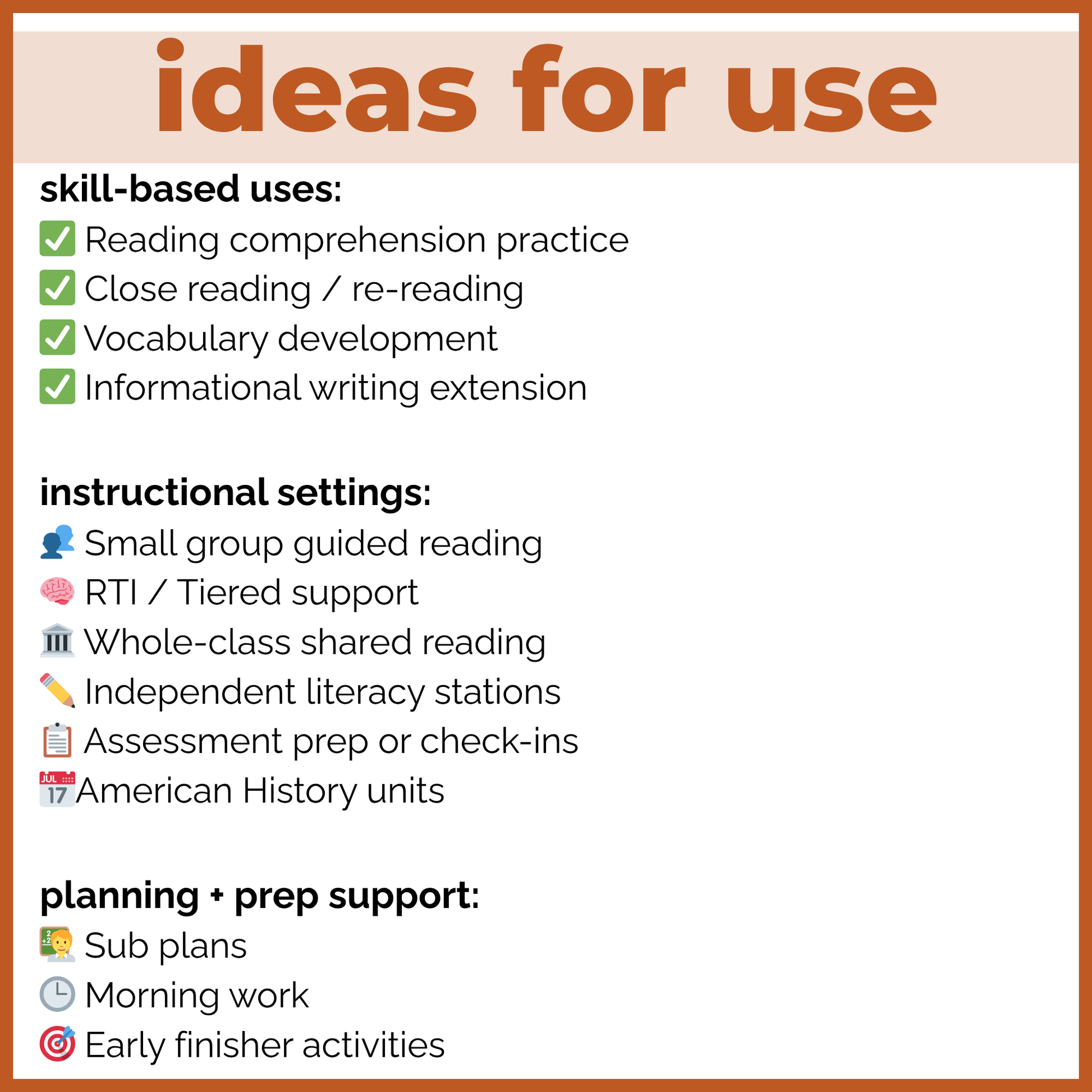 Each passage introduces fun, familiar topics connected to Westward Expansion, helping learners build key reading skills in a meaningful and engaging way.