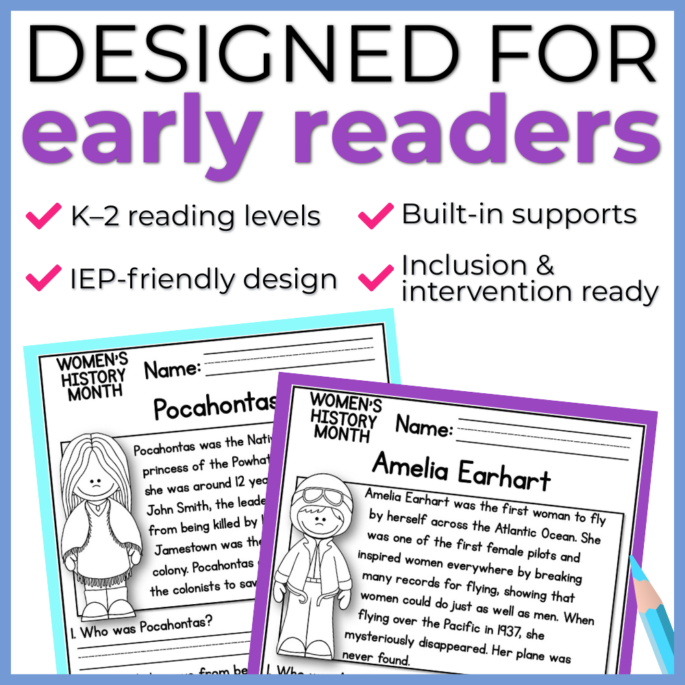 Looking for a no-prep Women’s History Month reading activity to build early literacy skills while keeping learners engaged? These Women’s History Month–themed reading comprehension passages are designed for young readers at a Kindergarten, 1st grade, or 2nd grade reading level. Each passage supports fluency, vocabulary development, and comprehension strategies, and features engaging women’s history reading passages written as clear, accessible informational text. This resource blends women’s history reading comprehension with meaningful social studies reading, helping students learn about important historical figures in an age-appropriate way.